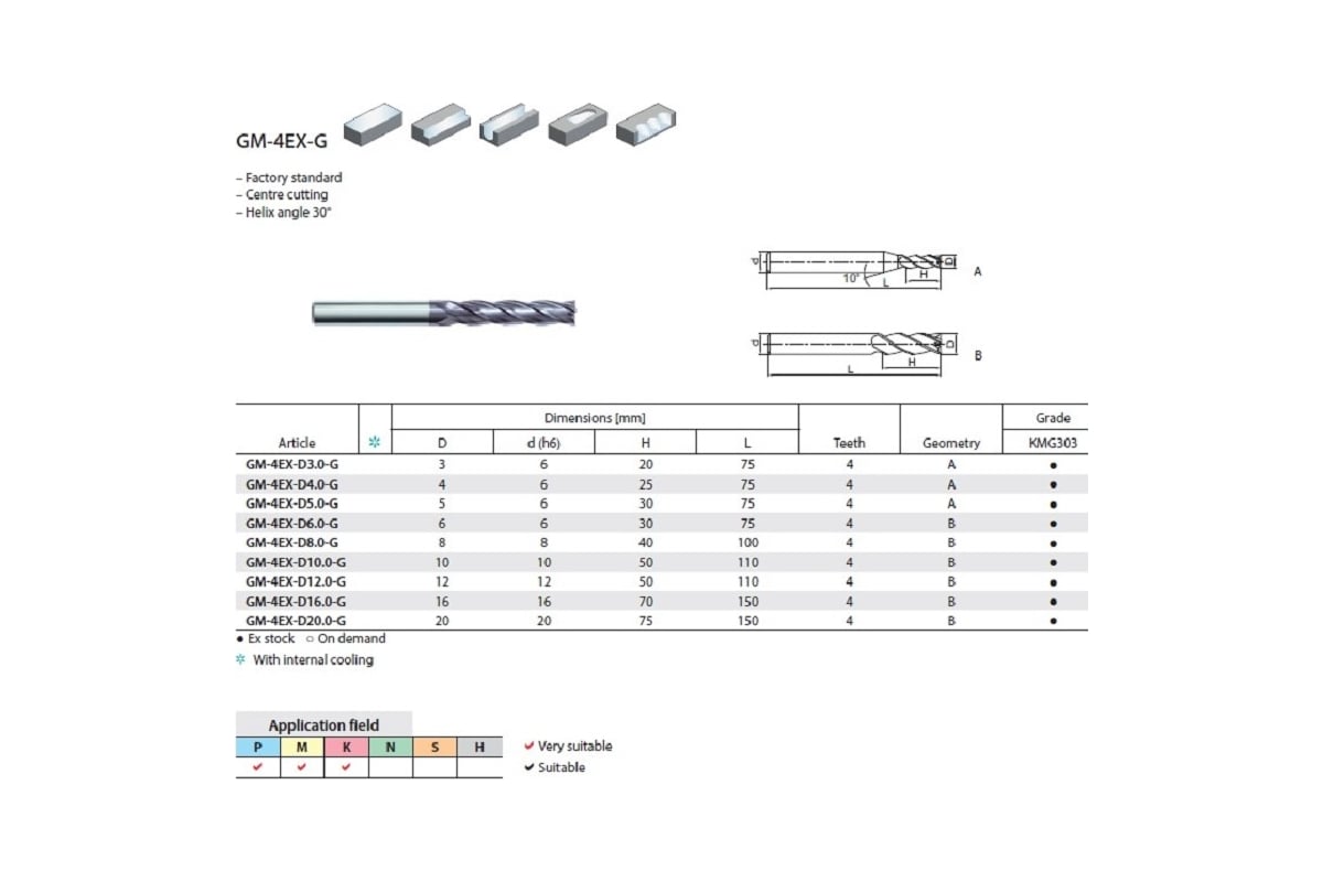 Концевая монолитная твердосплавная фреза с покрытием. Серия GM до 40 HRC для обработки стали, чугуна, нержавеющей стали. Удлиненная рабочая часть EX с цилиндрическим хвостовиком и углом резания 30 градусов.