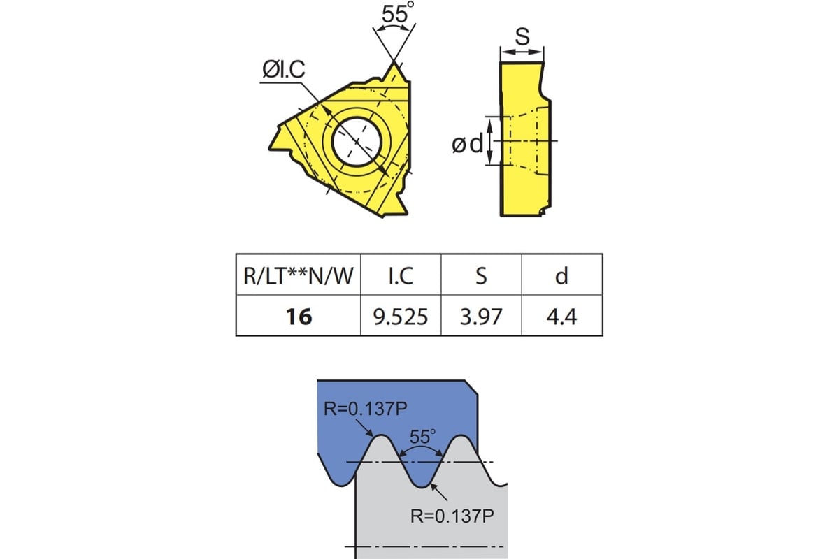 Пластина твердосплавная для нарезания внутренней резьбы с многослойным покрытием PVD, сплав YBG205 предназначен для обработки черной, нержавеющей стали и суперсплавов. Дюймовая резьба (11 ниток) с профилем 55°.